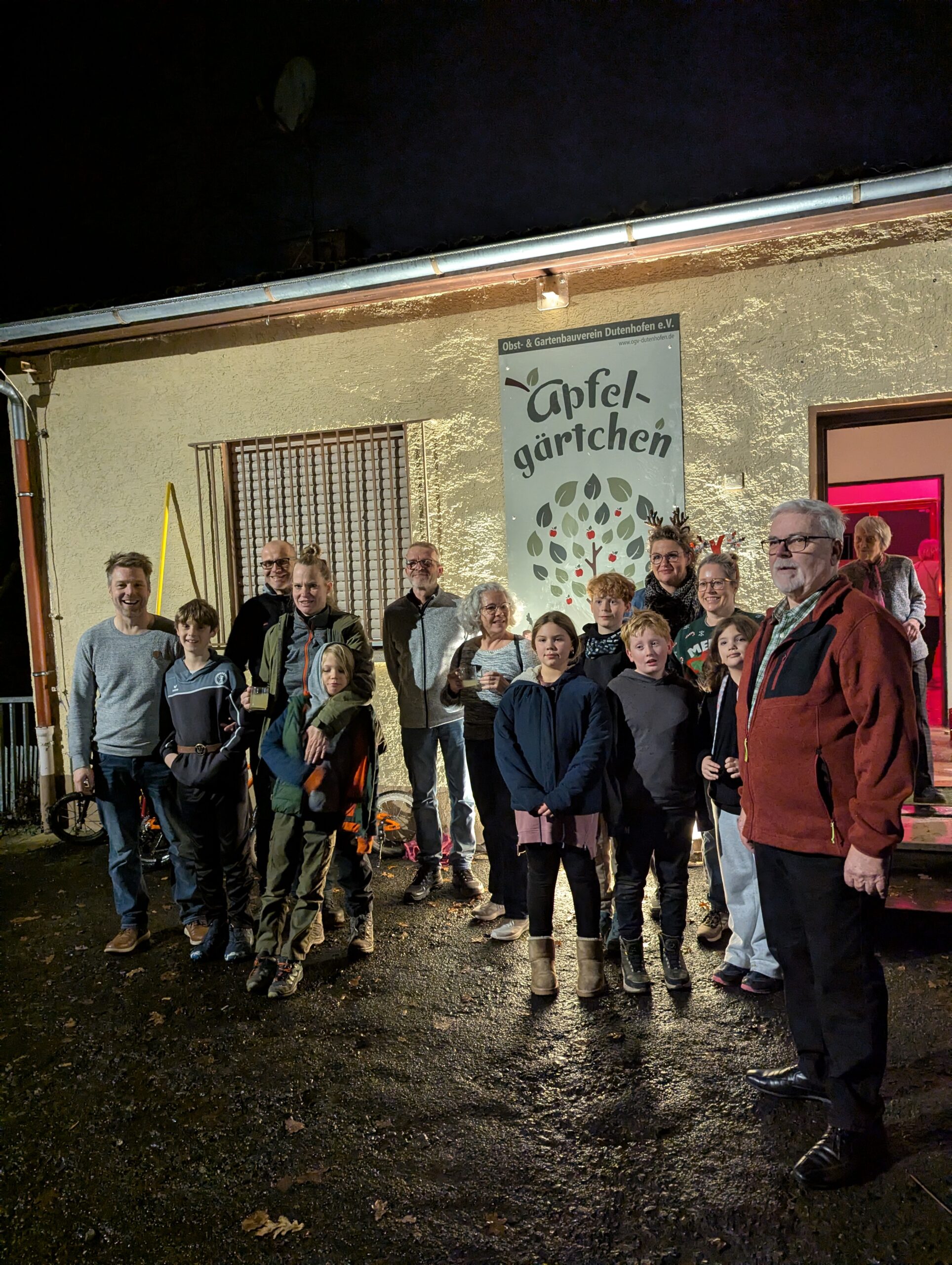 Das Highlight des Abends drohte dann fast dem Regenwetter zum Opfer zu fallen. Doch die abgebrühten Obst- und Gartenbauer ließen sich davon nicht unterkriegen: Sie enthüllten ihr neu angebrachtes Vereinsschild, das ab jetzt die Fassade des Apfelgärtchens schmückt. Der neue Name des Vereinshauses ist damit leichter zu merken und bleibt so bestimmt noch einfacher im Gedächtnis der Besucher.